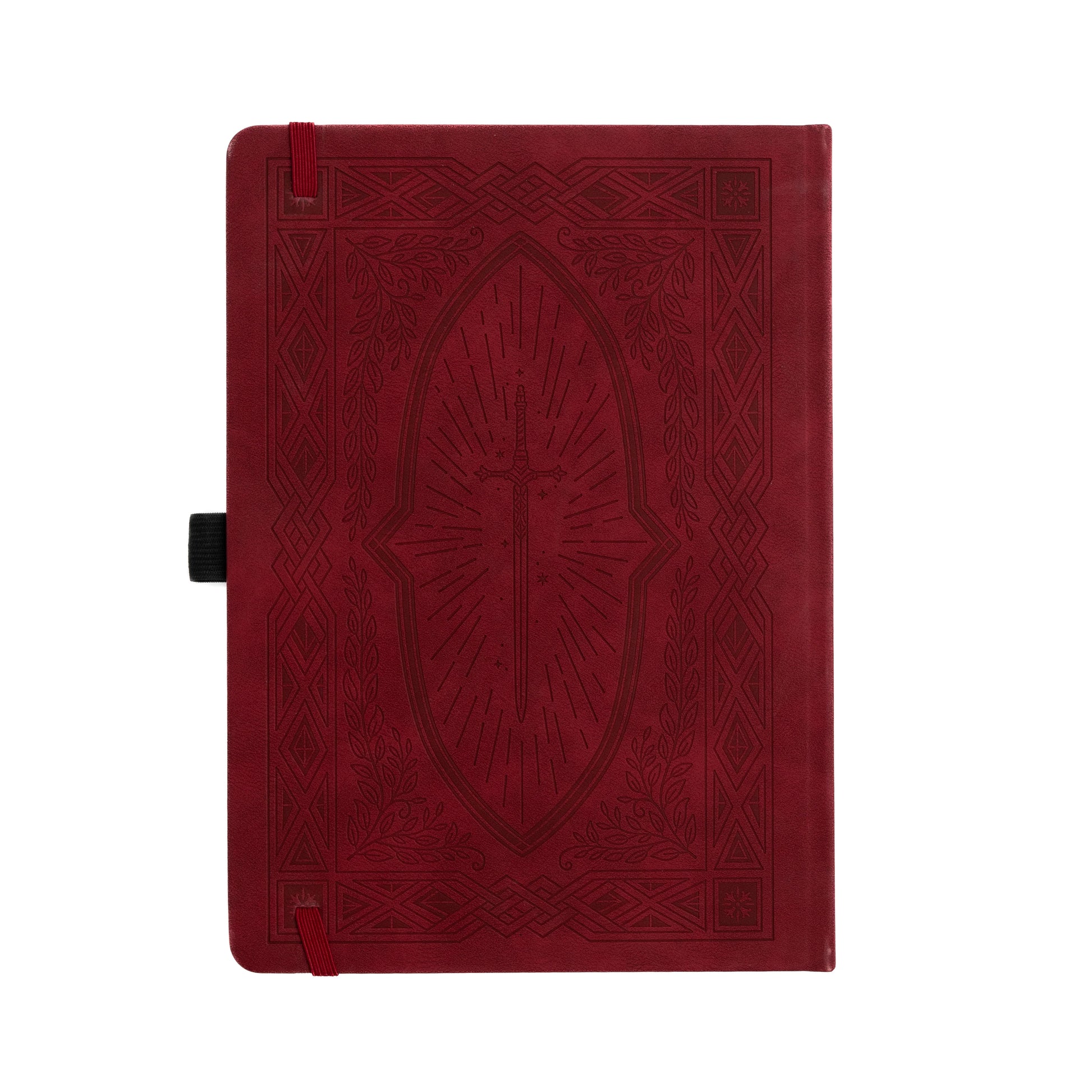 Channel classic fantasy vibes with the Knight’s Sword Notebook, designed with a Red Vegan Leather cover and an ornate gold foil sword centrepiece framed by intricate geometric detailing. The matching spine design adds a bold finishing touch, making this notebook feel like it belongs in a royal library.