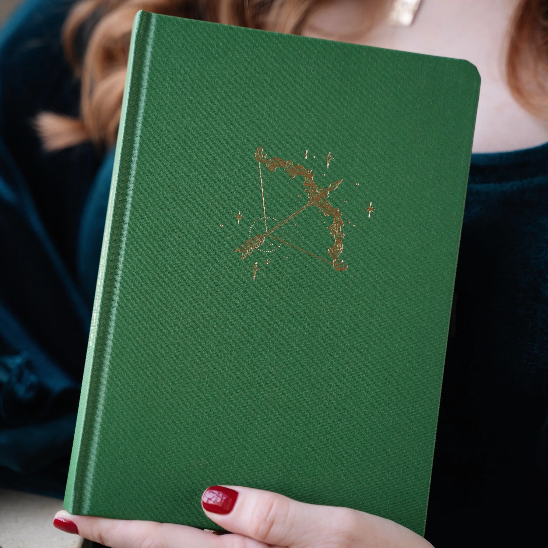 Bold and timeless, The Archer Notebook features a deep green buckram cover with a striking gold foil bow-and-arrow design, surrounded by subtle celestial sparkles for a touch of magic. The matching spine detail adds an extra layer of charm, making it as beautiful on a shelf as it is in your hands.