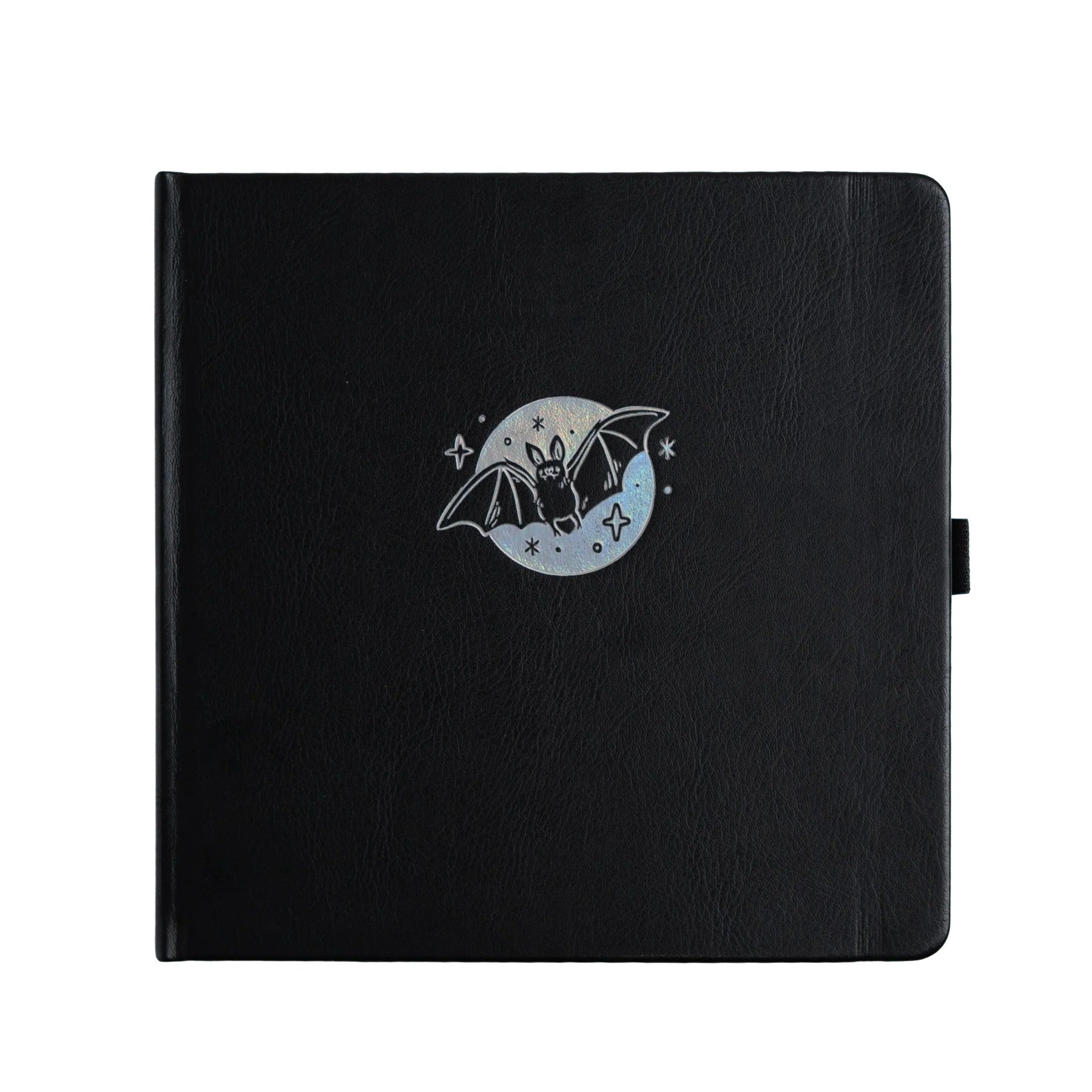 This notebook features a mischievous bat flying over the moon design, stamped in holographic silver on a smooth black vegan leather cover.