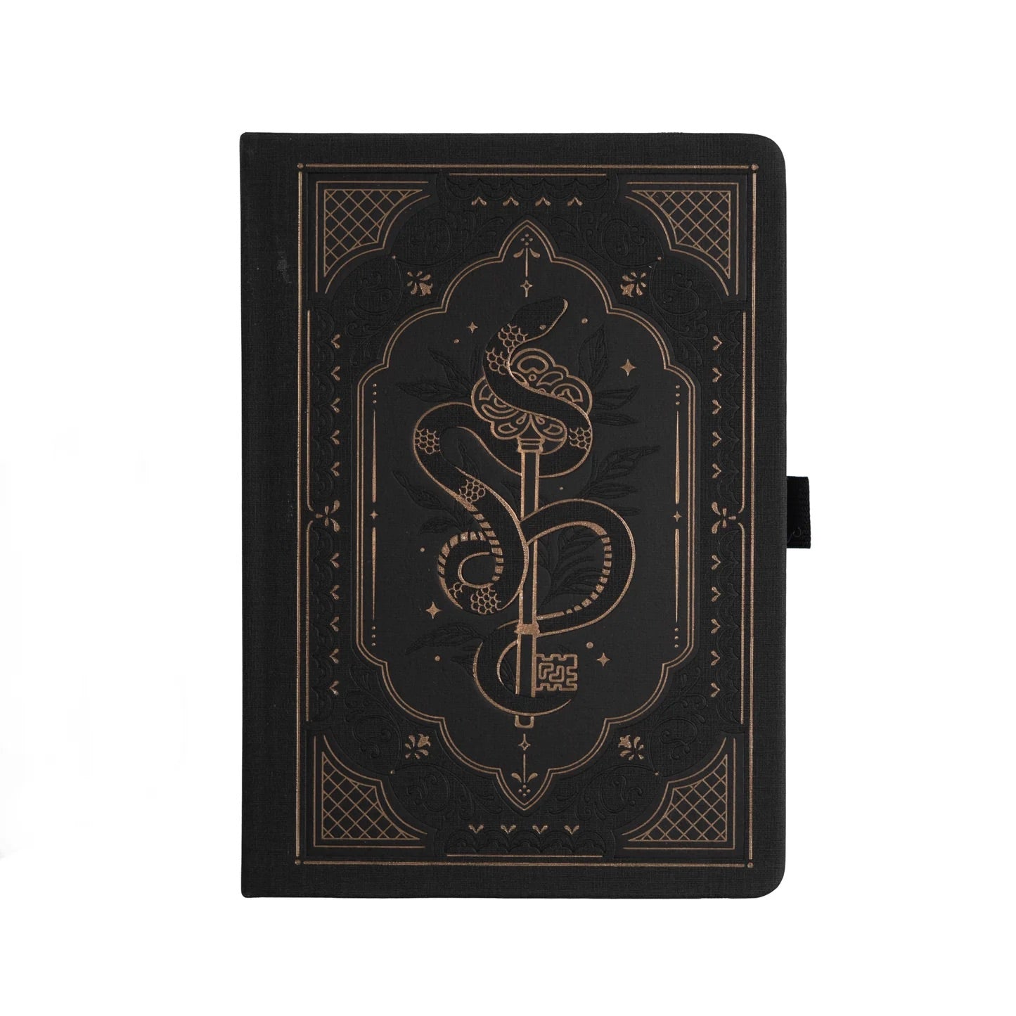The design features an intricate snake and key design, part debossed and part hand stamped with a bronze foil on a dark gray vegan leather cover. The pages feature hand-torn edges, adding to the antique feel of the notebook.