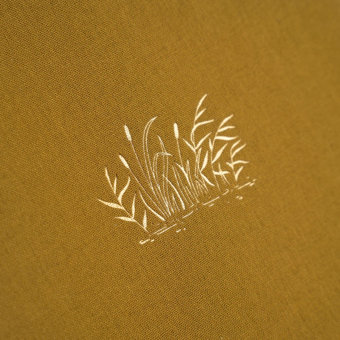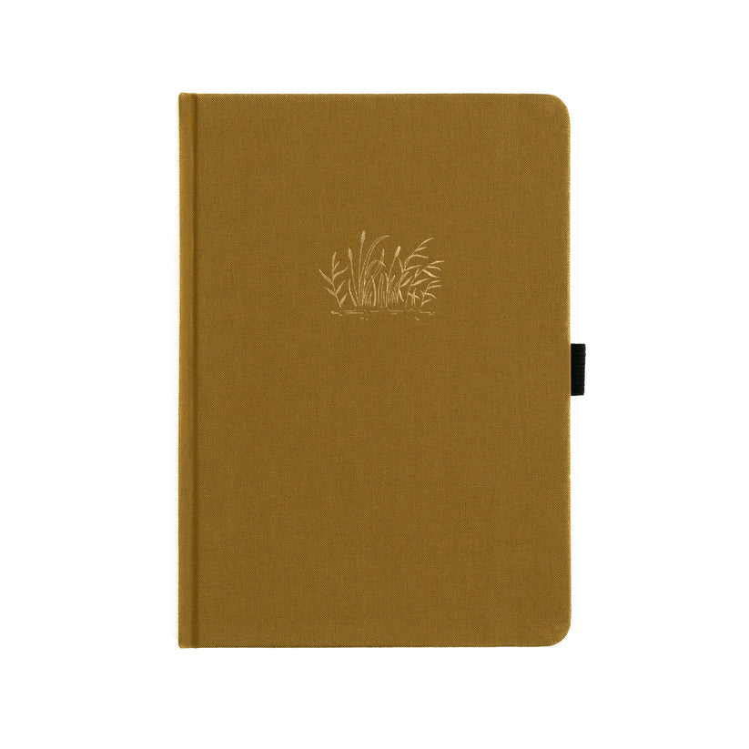 Introducing the A5 Gentle Breeze notebook, a bundle of reeds swaying in the air, stamped in gold on a yellow ochre cotton cover.