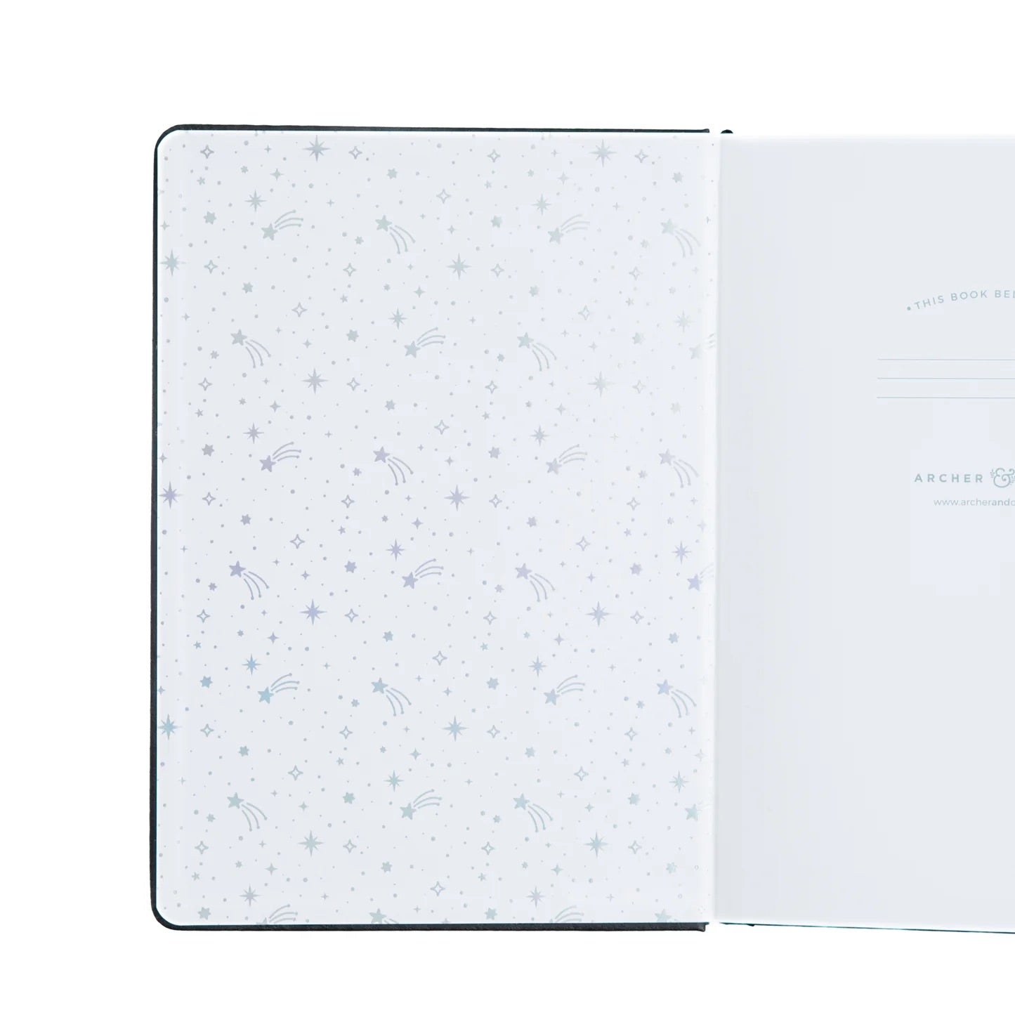 This notebook features a full cover moon and skies design, stamped in holographic silver on a textured black vegan leather cover.