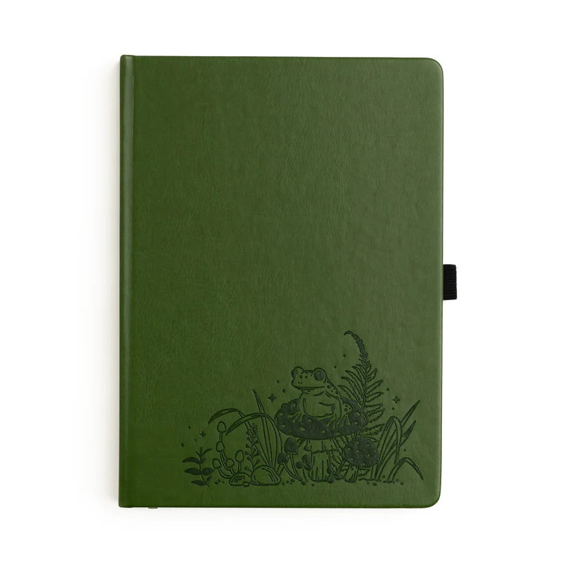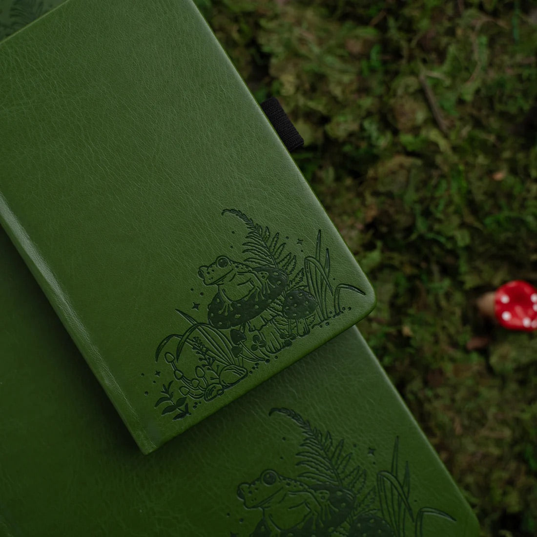 Introducing the A5 Mushroom Monarch notebook, featuring a frog perched upon a mushroom, debossed on a green vegan leather cover.