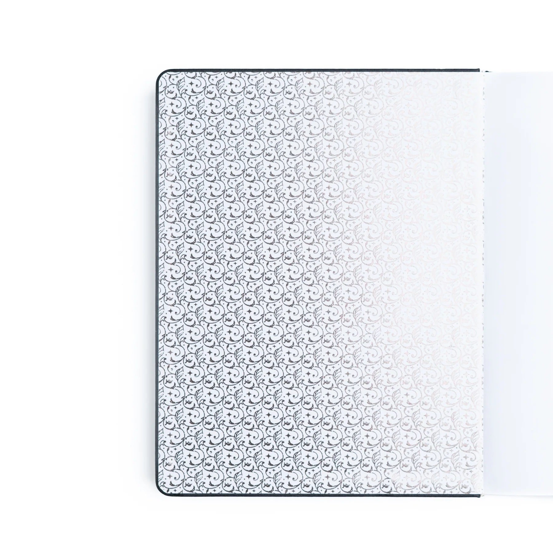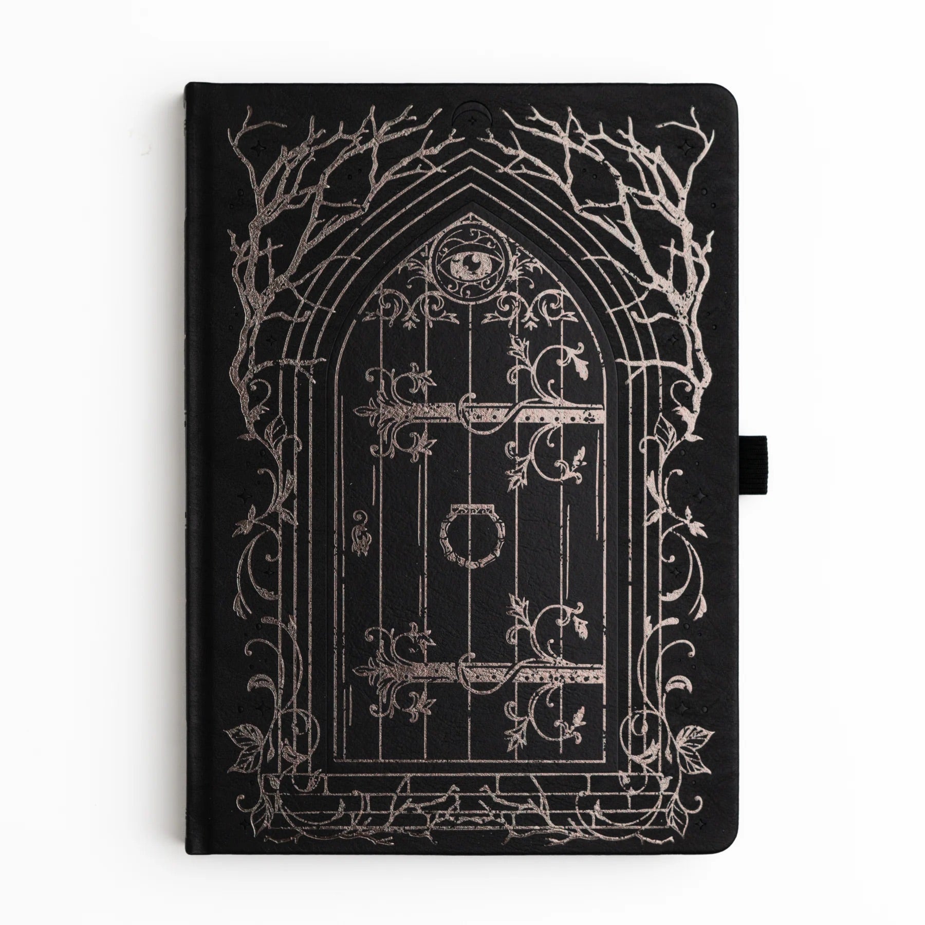 Introducing the Spell Book notebook, featuring an intricate door design, part debossed and part hand stamped with an iridescent foil with a pewter and copper shift on a black vegan leather cover.