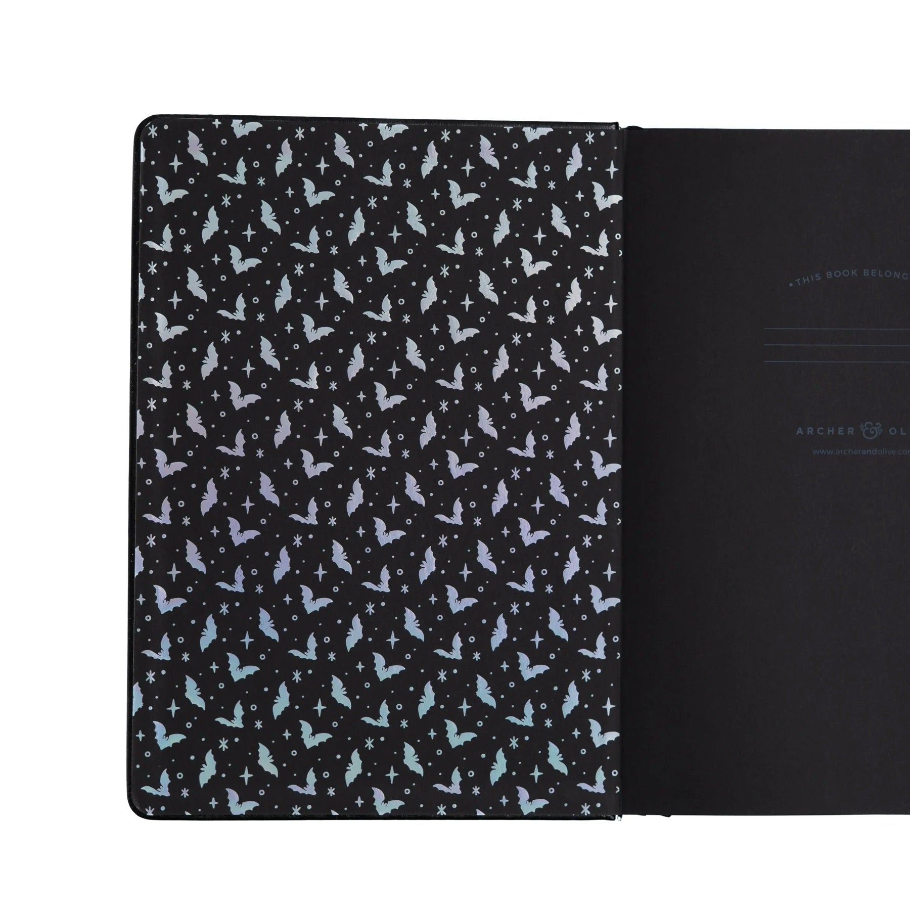 This notebook features a mischievous bat flying over the moon design, stamped in holographic silver on a smooth black vegan leather cover.