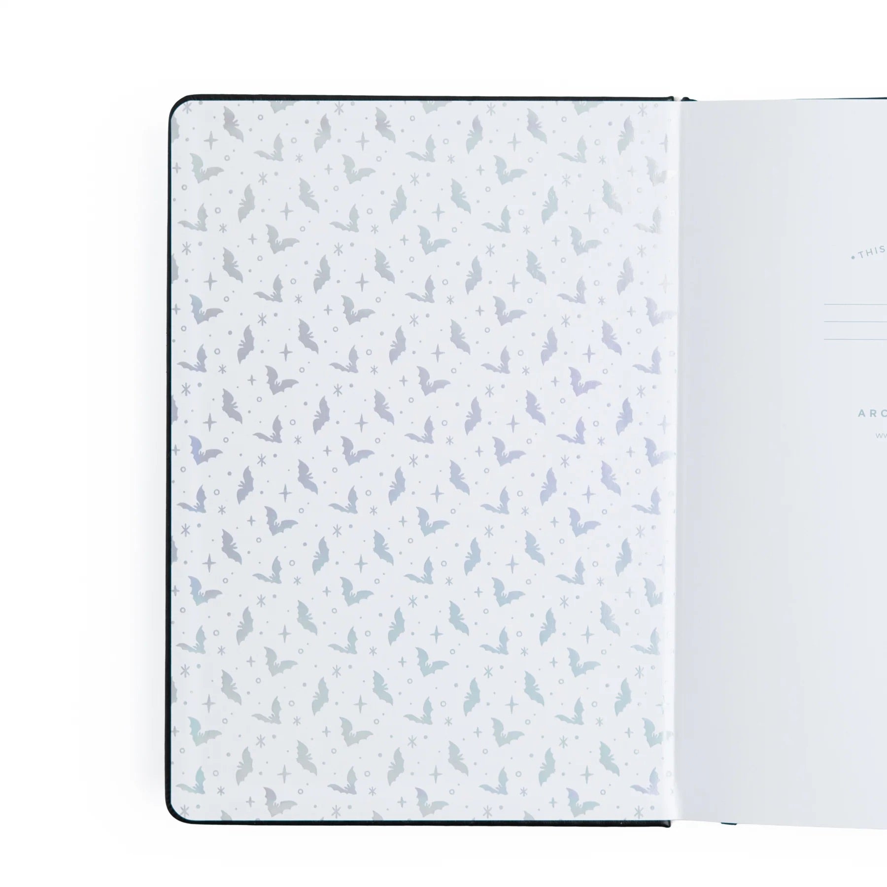 This notebook features a mischievous bat flying over the moon design, stamped in holographic silver on a smooth black vegan leather cover.