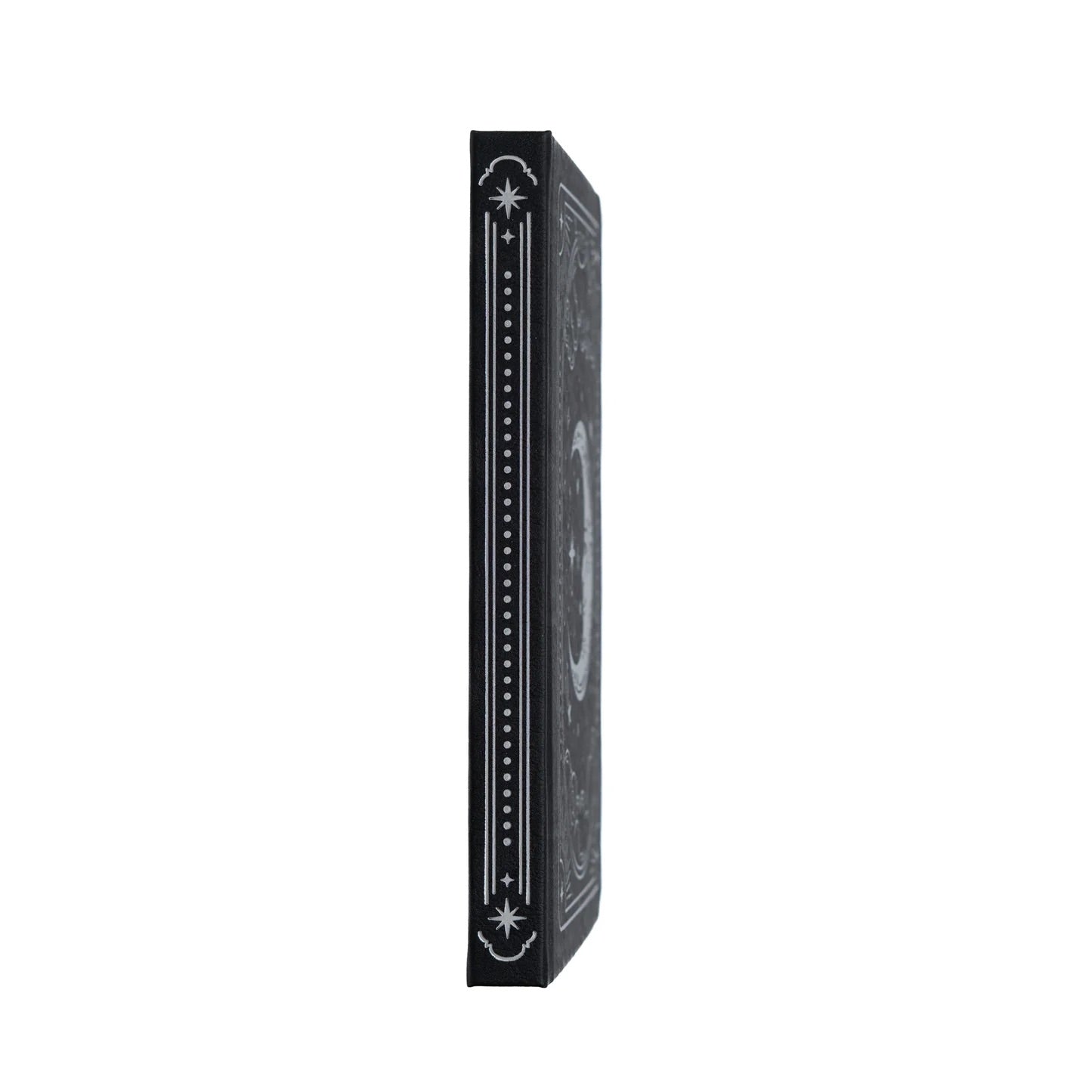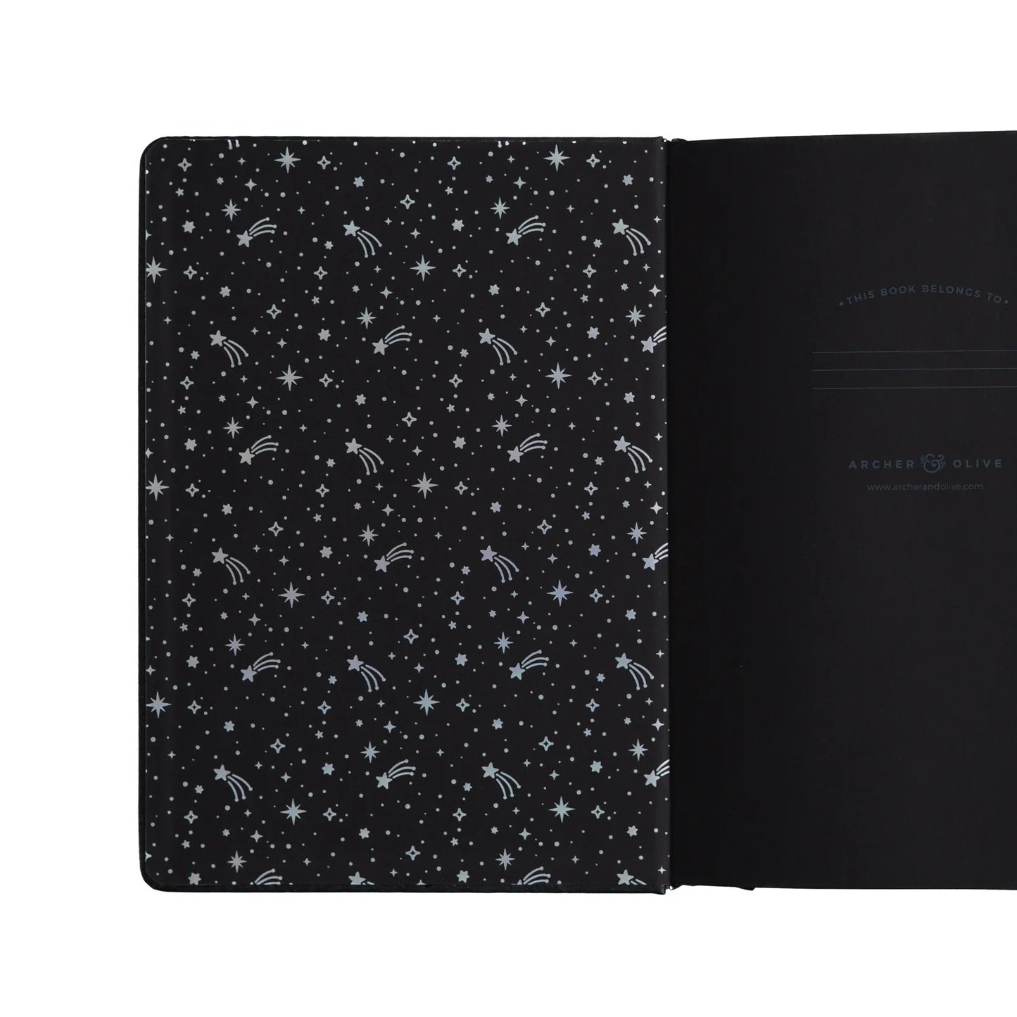 This notebook features a full cover moon and skies design, stamped in holographic silver on a textured black vegan leather cover.