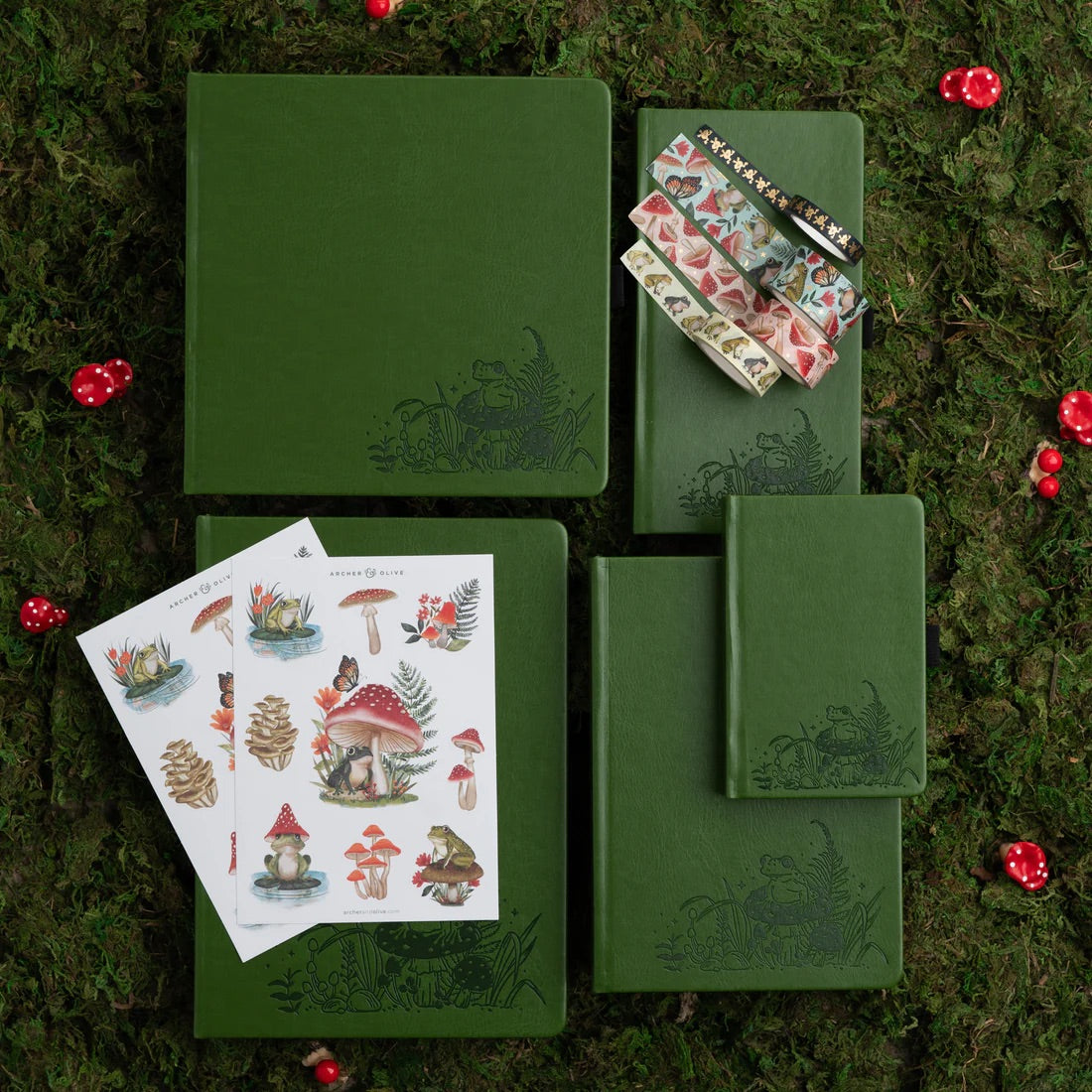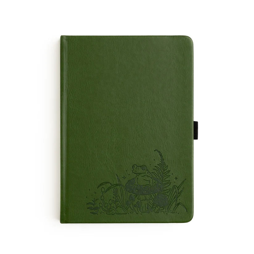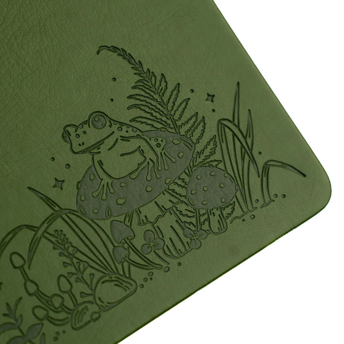 Introducing the B5 Mushroom Monarch Notebook, featuring a frog perched upon a mushroom, debossed on a green vegan leather cover.