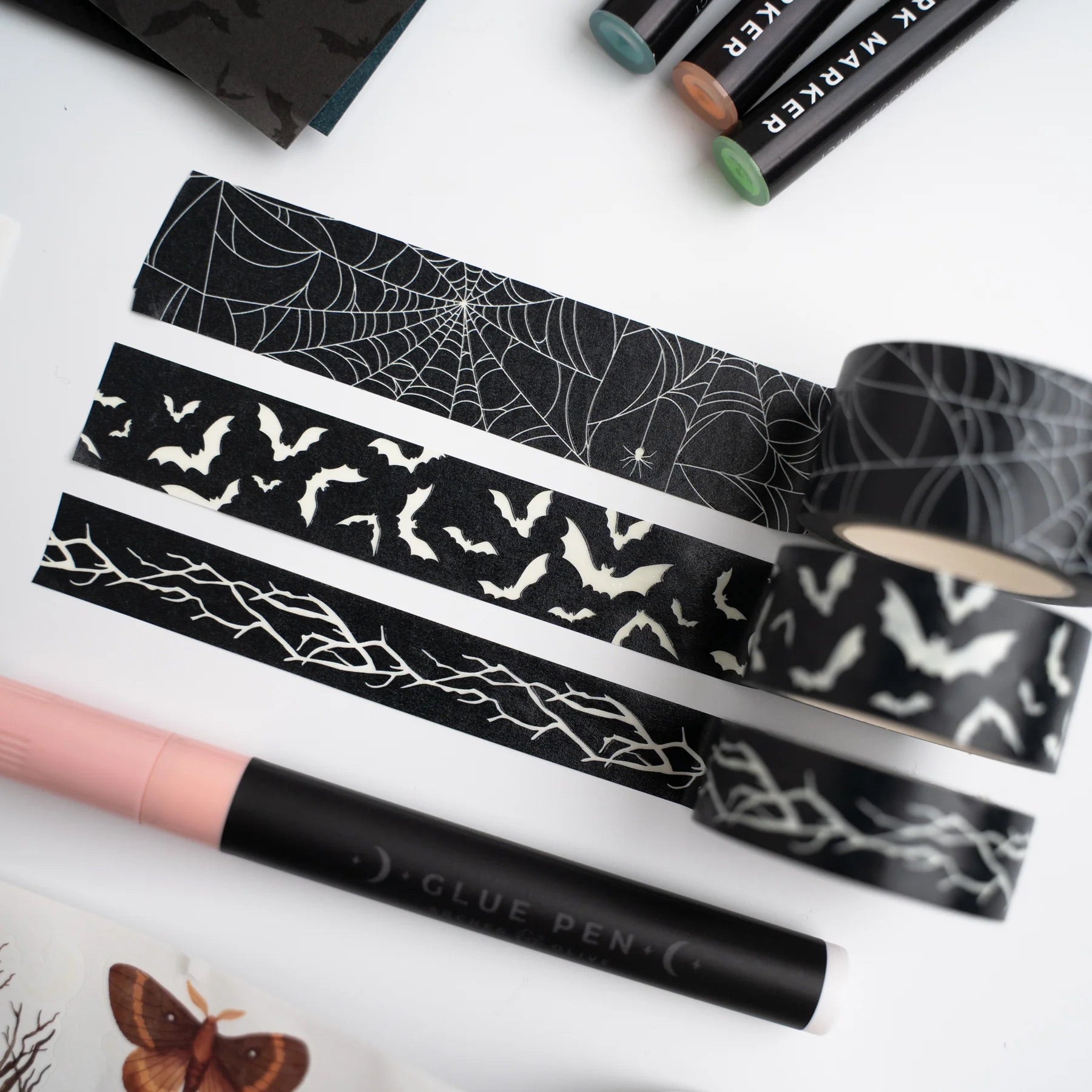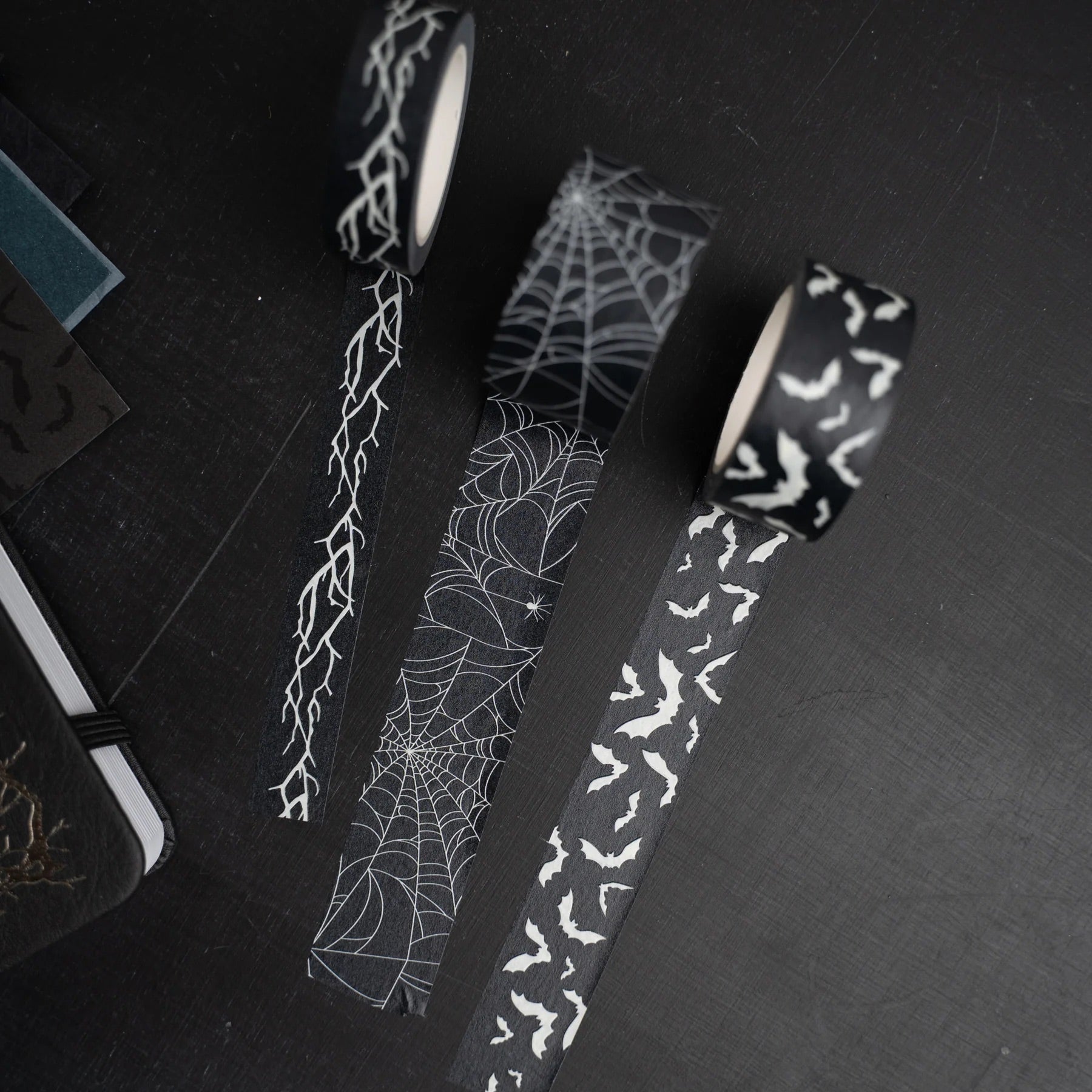 This new set features three designs, including flying bats, delicate spider webs, and intricate branches. Turn off the lights to see the tape's eerie glow.