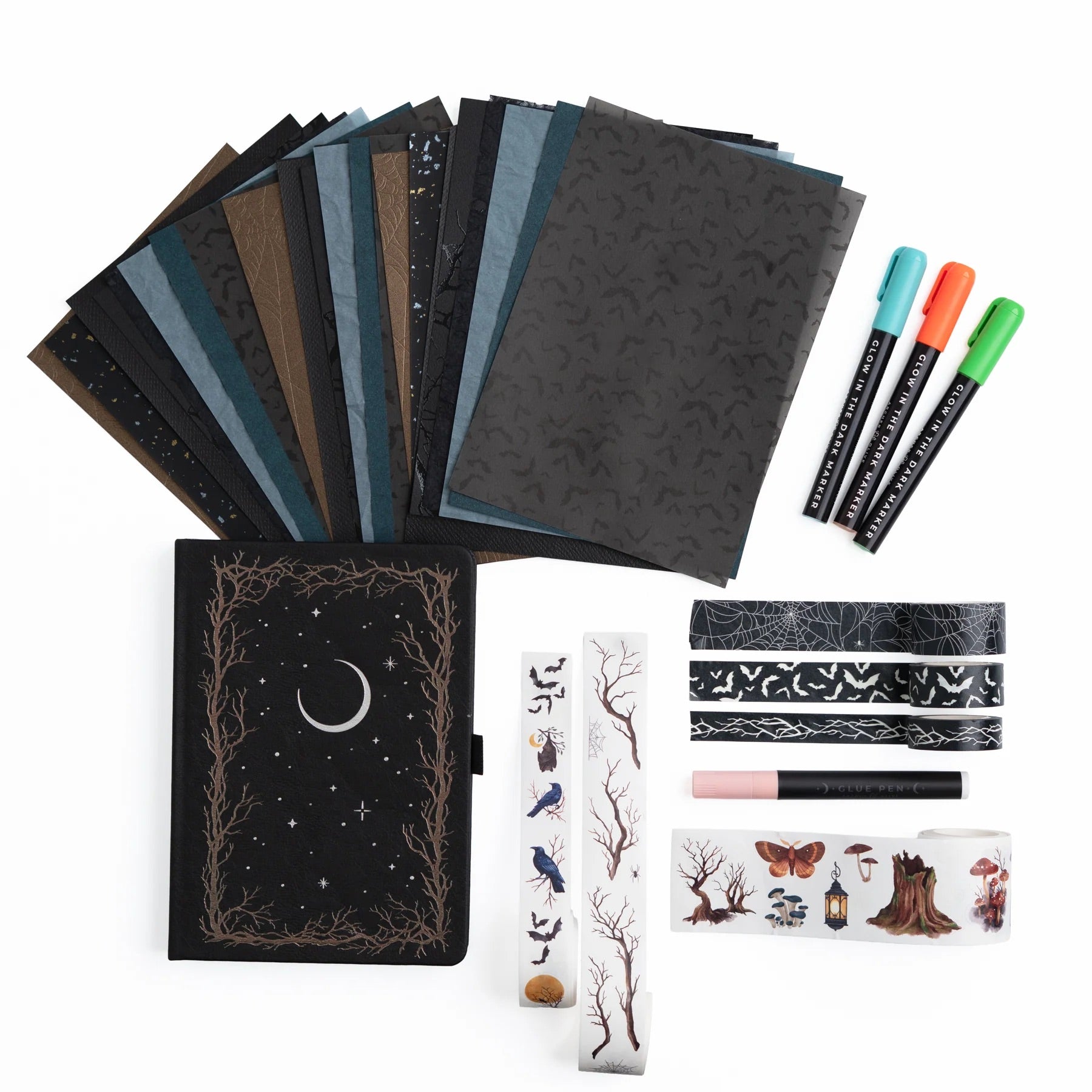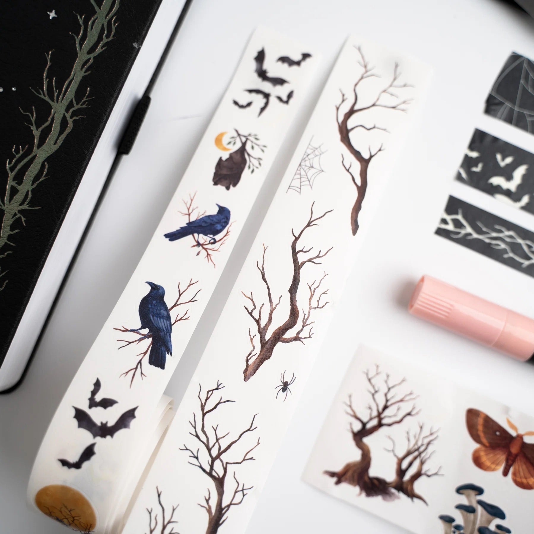 This brand-new product features three rolls of designs inspired by late autumn: bare branches, delicate spider webs, nocturnal creatures, glowing lamps, and forest mushrooms.